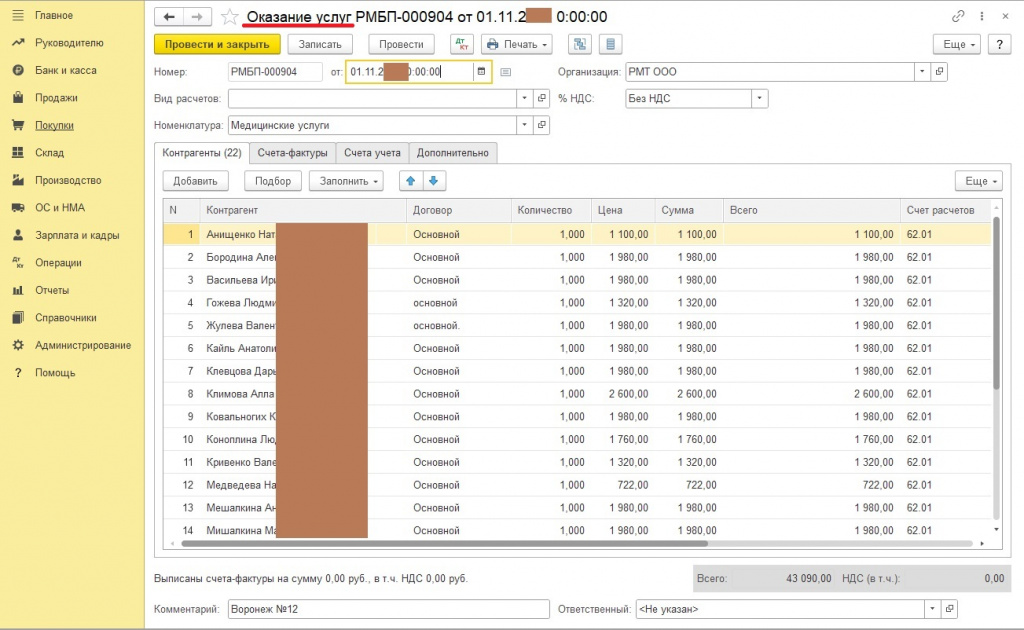 В 1С: Бухгалтерию предприятия 3.0 загружается документы «Оказание услуг»за период. За один день создается один документ, со списком пациентов. Было принято решение не загружать документом «Реализация (акты, накладные, УПД)», чтобы не вносить тысячи документов.