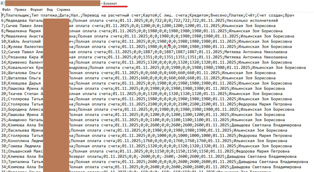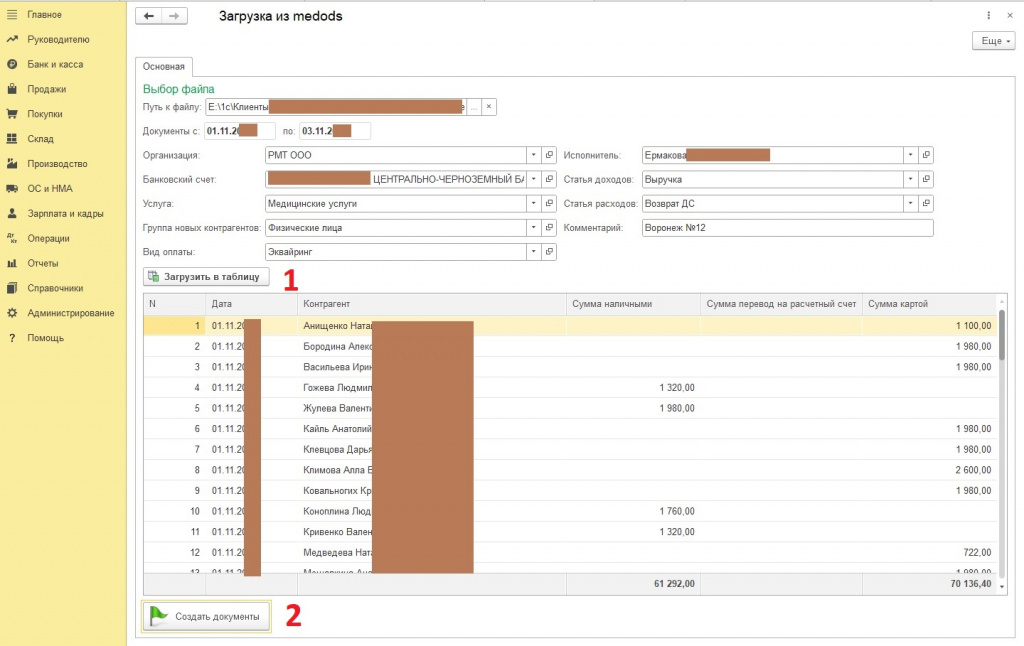 Создаются денежные документы на каждого пациента отдельно, такие как «Приходный кассовый ордер», «Расходный кассовый ордер», «Оплата платежной картой», «Оплата платежной картой», «Поступление на расчетный счет» и «Списание с расчетного счета».