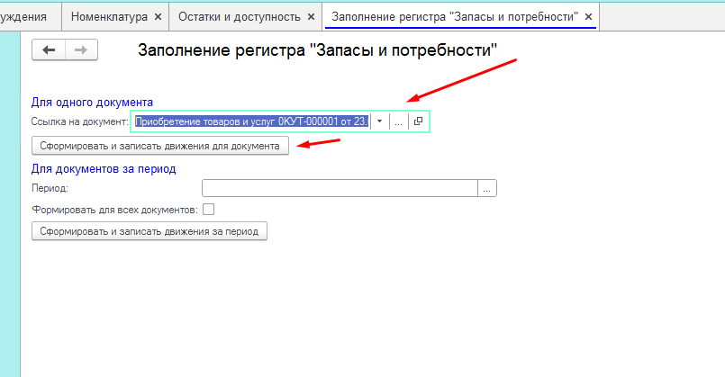 Так же можно создать движения для единичного документа. Для этого нужно его выбрать в поле "Ссылка на документ" и нажать "Сформировать и записать движения для документа".