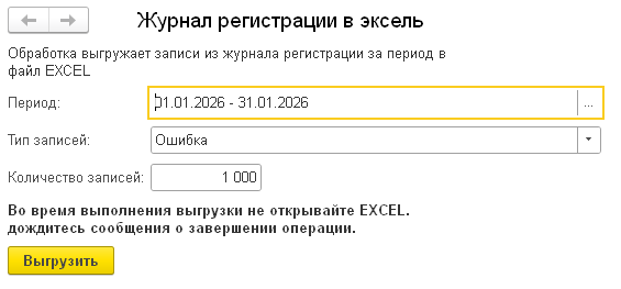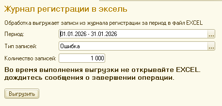 Обработка выгружает определенный тип записей из журнала регистрации (изначально было сделано для ошибок, но можно выбирать любой тип)