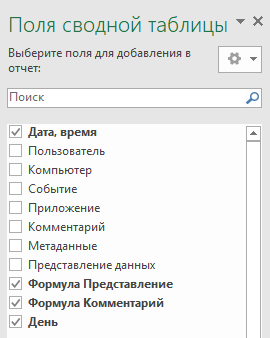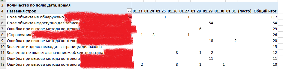 В результате в файл Excel выгружаются все ошибки за период. Затем они группируются средствами Excel в сводную таблицу. В группировке используются только первые символы из полей Представление и Комментарий. Группировки можно выбирать. Если нужно добавить пользователя, то достаточно установить галочку в настройке сводной таблицы.