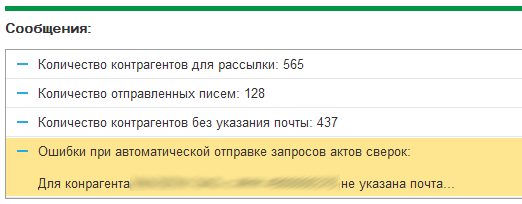 Для пользователя после окончания рассылки выводятся статистические показатели. При нажатии на последнее сообщение с ошибками видно всех контрагентов, у которых не указана почта.
