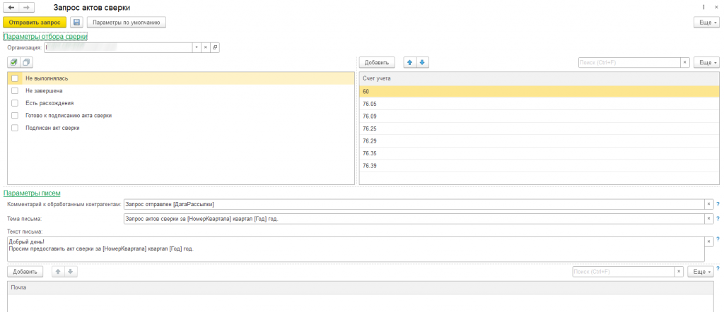 • Текст письма - письмо контрагенту отправляется с этим текстом. По умолчанию "Добрый день! Просим предоставить акт сверки за [НомерКвартала] квартал [Год год]". Есть 2 параметра, которые можно убрать при необходимости;