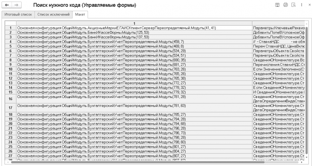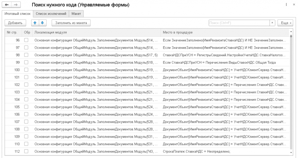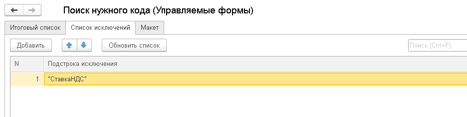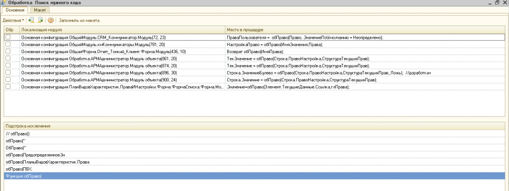 Как работает обработка. Открываете обработку через меню Файл-Открыть. Копируете в пользовательском режиме в Макет обработки найденные строки глобального поиска. Далее нажимаете кнопку "Заполнить из макета". Далее добавляете лишние подстроки строк и нажимаете кнопку "Обновить". Список строк будет отфильтровываться и уменьшаться (см. скрин в ленте).