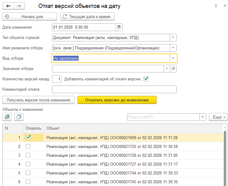 Откат объектов с отборами по реквизитам