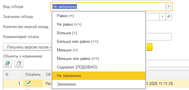 Обработка позволяет выбрать кроме отбора и количество версий, на сколько нужно откатить, заполнить свой комментарий или оставлять стандартный комментарий при откате.