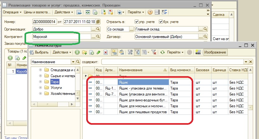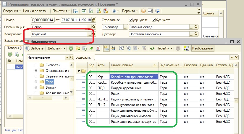 2. После этого для документов, в которые встроена подсистема, условие отбора будет учтено при вводе данных. На картинках в примере для контрагента "Крупский" пользователь может выбирать любую номенклатуру, для контрагента "Морской" только номенклатуру, соответствующую условию отбора.
