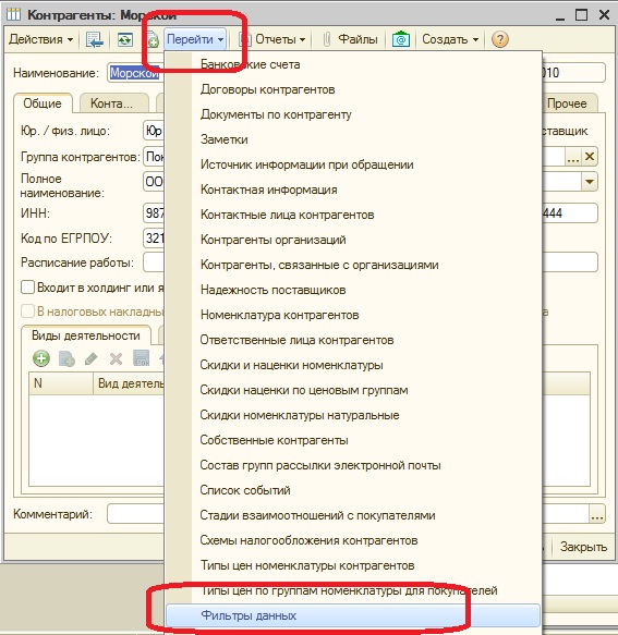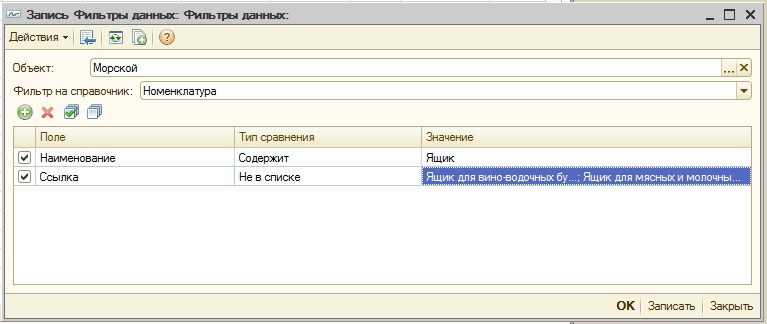 1.  Для настройки фильтров для конкретного элемента необходимо для него выбрать "Перейти" - "Фильтры данных" и добавить настройку отбора. Укажем, что для контрагента "Морской" можно использовать только номенклатуру, содержащую в названии "Ящик", кроме "Ящика для вино-водочных бутылок" и "Ящика для мясо-молочных"