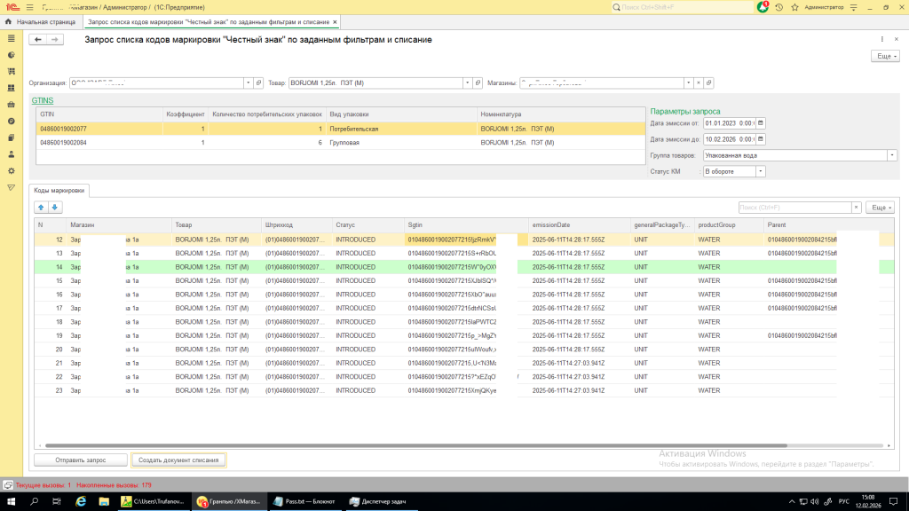 Выделите строки используя ctrl и shift и нажмите кнопку "Создать документ списания", строки с марками перенесутся в документ "Выбытие ИСПМ".