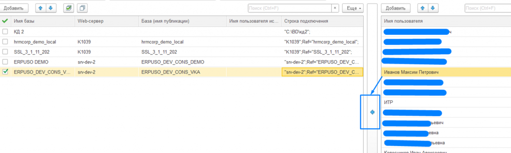 Встаем на любую строку таблицы баз. Выбираем Иванова в списке пользователей и нажимаем «стрелку».