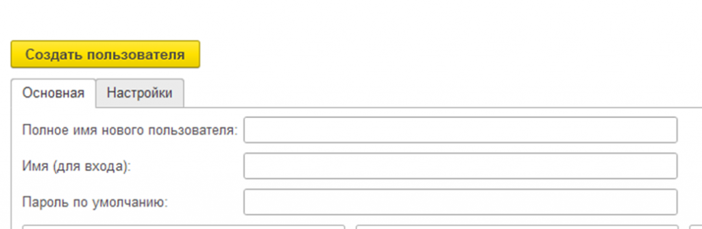В шапке обработки указываем полное имя нового пользователя, имя для входа. Указываем пароль по умолчанию (сервис заточен под смену пароля самим пользователем при первом входе в информационную базу).