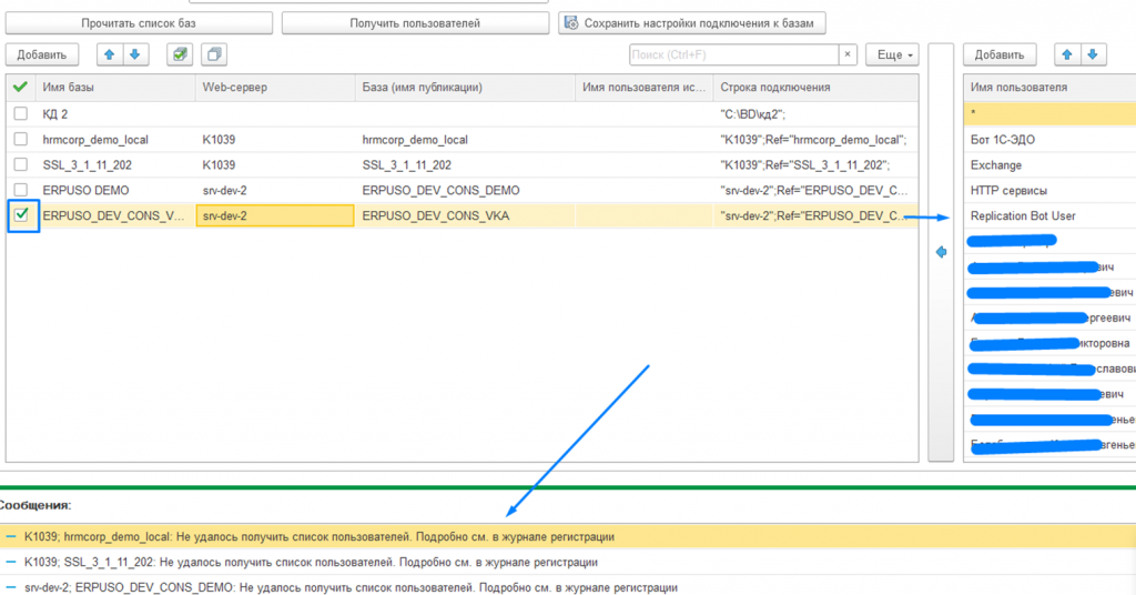 Если по какой-то причине для базы не удалось определить пользователей, то будет выдано соответствующее сообщение. Детали ошибки будут отражены в журнале регистрации.