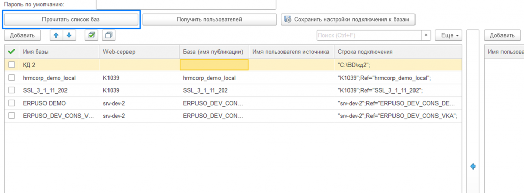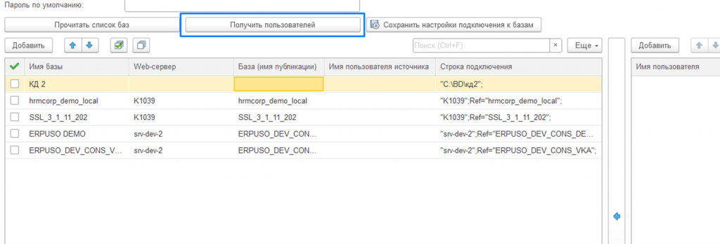 Список пользователей отображается для активной строки таблицы с базами.