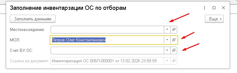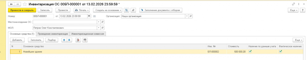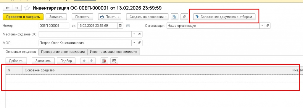 Быстрый инструмент автоматического заполнения документа «Инвентаризация ОС» по данным бухгалтерского учёта с учётом местонахождения и МОЛ.