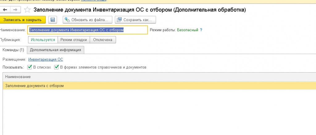 Сохраняет типовую логику документа «Инвентаризация ОС» и может подключаться через механизм дополнительных отчётов и обработок без изменения конфигурации.R03;