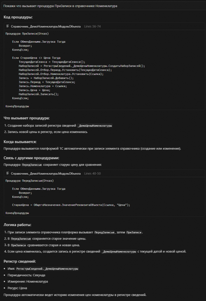 Пользователь: "Покажи что вызывает процедура ПриЗаписи в справочнике Номенклатура"