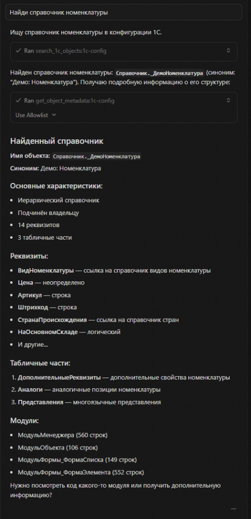 Пользователь: "Найди справочник номенклатуры"