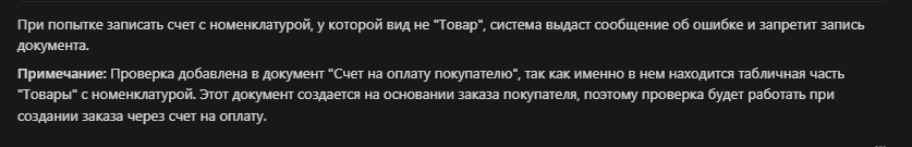 Пользователь: "Добавь в документ заказ клиента проверку на заполнение номенклатуры. Создавать заказ можно только с видом номенклатуры Товар"