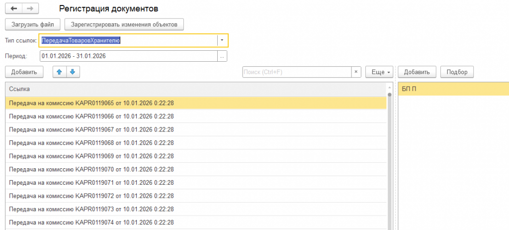 Затем в обработке указываем вид документа, период поиска и загружаем файл. В списке справа указываем узлы обмена, на которых нужно зарегистрировать изменения, жмём соответствующую кнопку. При регистрации будут учтены отборы на узлах.