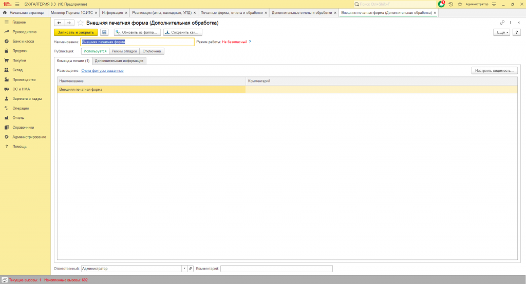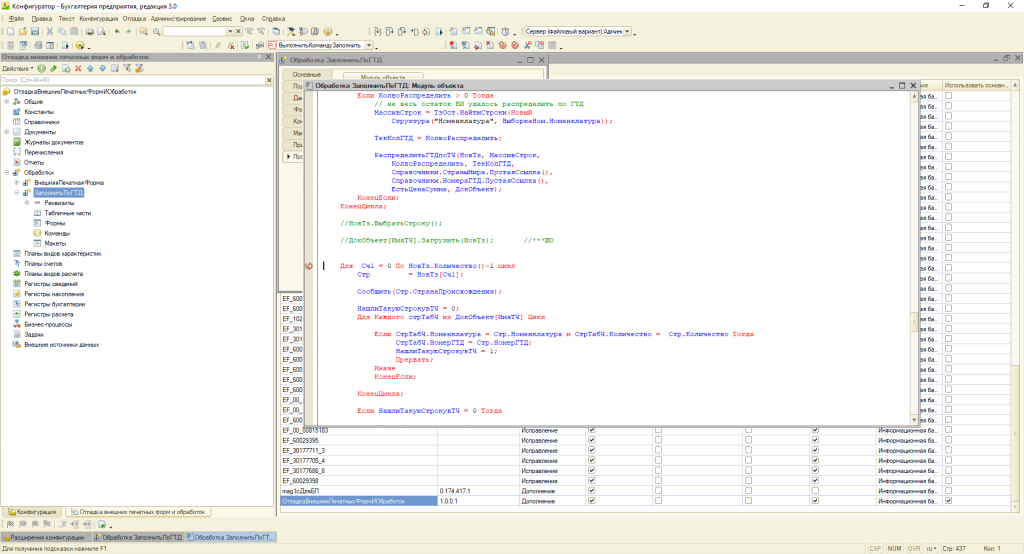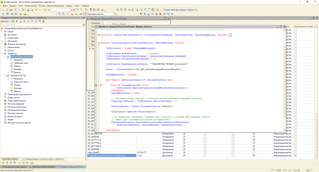 Отладка внешних печатных форм и обработок вызывает определенные трудности. Для решения этой проблемы, в конфигурациях с использованием БСП(Библиотеки стандартных подсистем), можно использовать данное расширение.