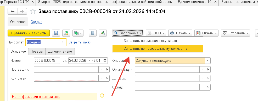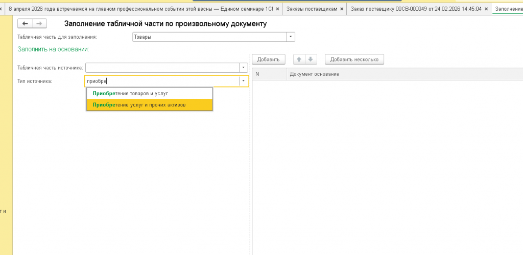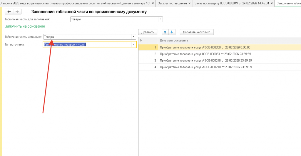 Заполнение табличной части документа по табличным частям любых других документов (множественный выбор):