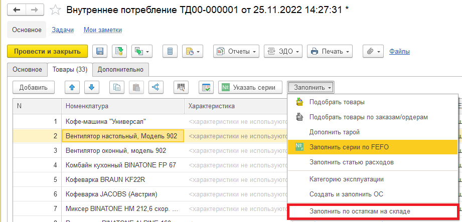 УТ11.5 Управление торговлей Внутреннее потребление Остатки товаров Остатки на складах Заполнение документа