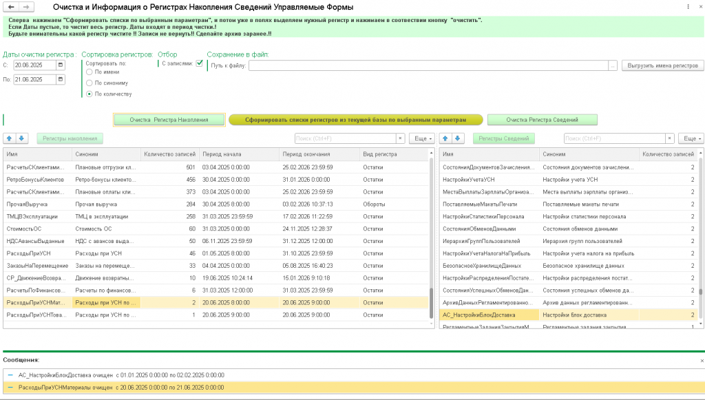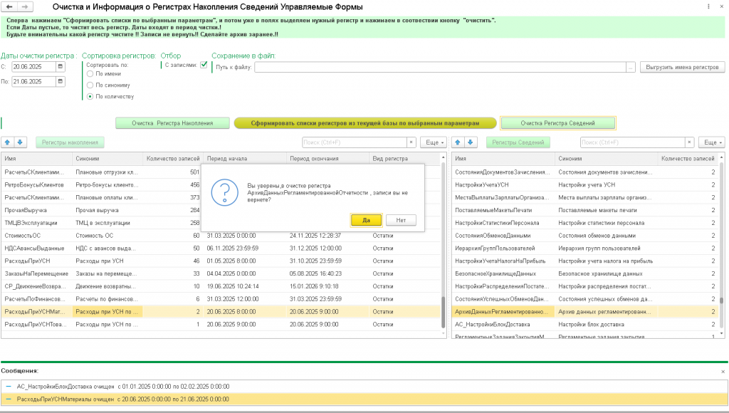 Очистка, удаление записей регистров сведений и накопления по выбранному периоду. Информация о регистрах