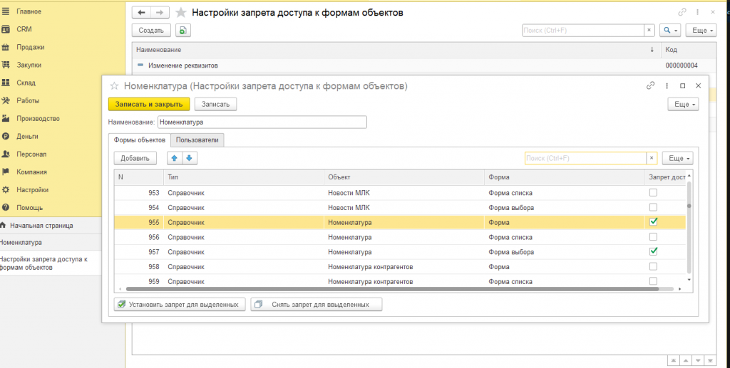 На форме настроек на вкладке "Формы объектов" выбираем, для какого объекта и для какой формы будет установлен запрет доступа.
