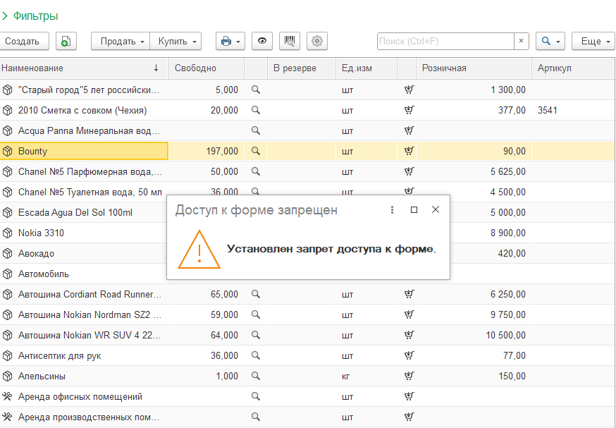 Управление доступом к формам Розница 3 / УНФ 3