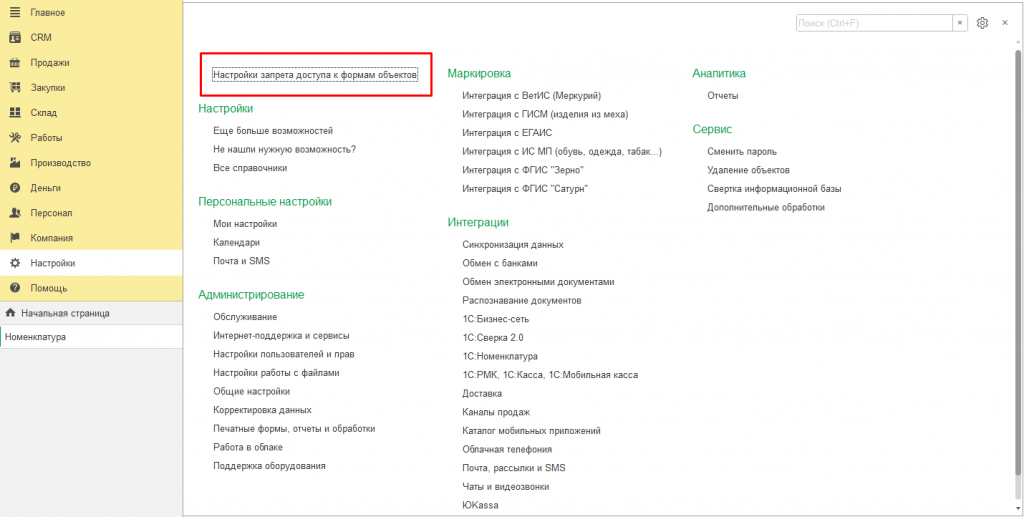 После добавления расширение в разделе "Администрирования" появится "Настройка запрета доступа к формам объектов".
