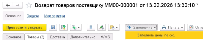 При выборе этой обработки через кнопку "заполнение" из возврата поставщику, сразу программа заполняет цены по себестоимости из данных регистра.