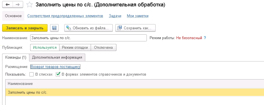 Обработка добавляется в УТ 11.5 как внешняя обработка. При выборе этой обработки через кнопку "заполнение" из возврата поставщику, сразу программа заполняет цены по себестоимости из данных регистра.