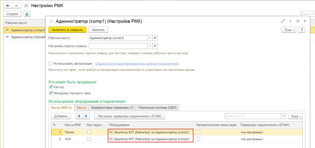 - возможность в справочнике "Настройки РМК", назначения нескольким кассам ККМ одного и того же оборудования (ККТ);
