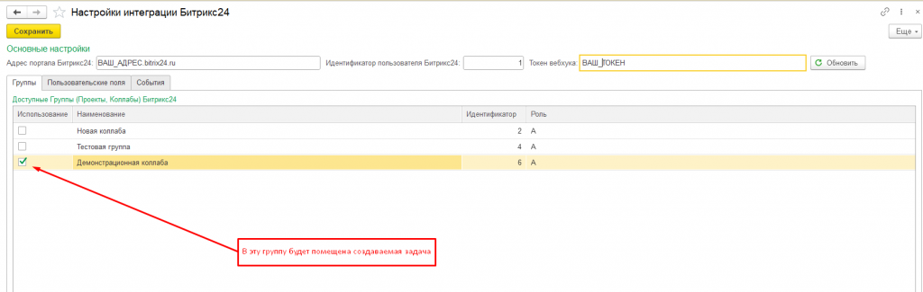 - Нажимаем кнопку "Обновить". После этого в табличные части будут автоматически "подтянуты" сведения о группах Битрикс, доступных пользователю, хранилищах файлов, а также - составу пользовательских полей задач. После этого: