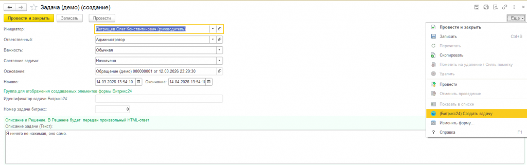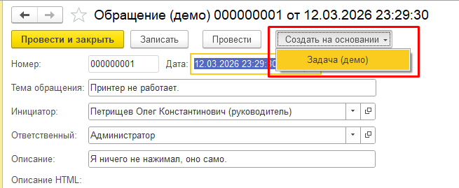 На основании "Обращения" создаем документ "Задача (демо)".