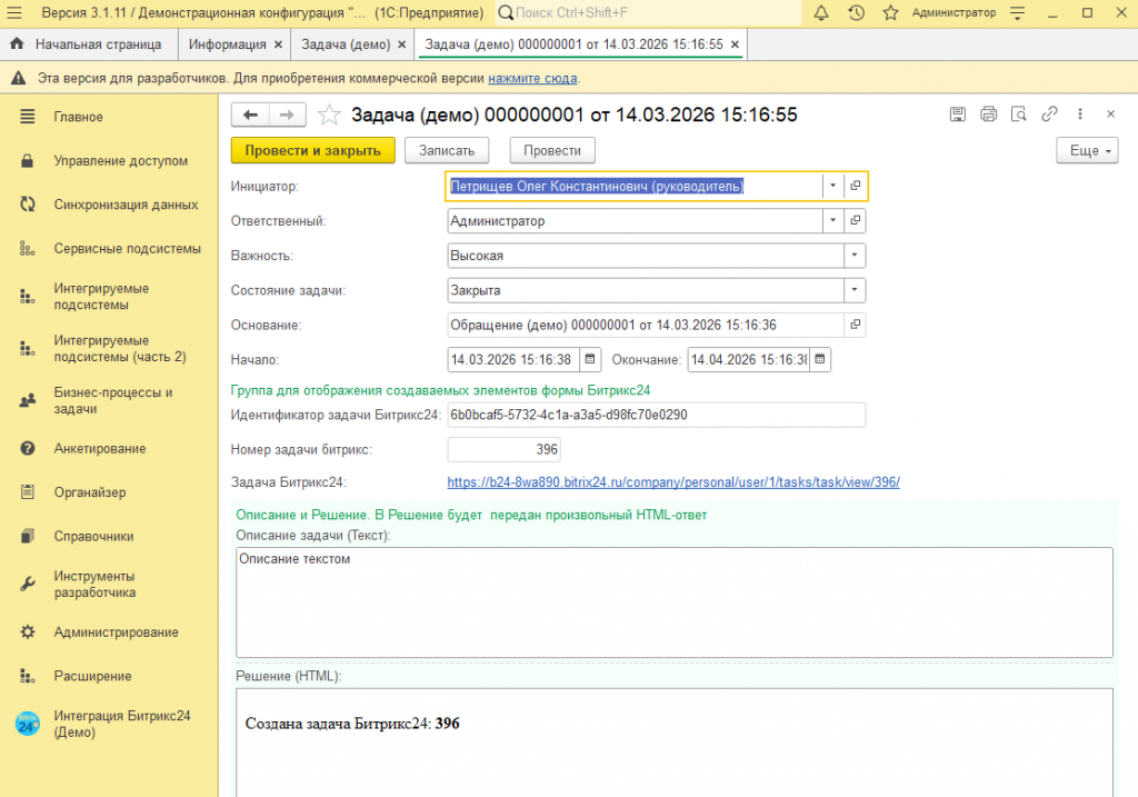 Раздел 4. Создание задачи Битрикс24 из формы Документа.