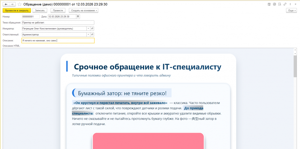 Создаем в 1С документ «Обращение (демо)» . Для упрощения тестирования:  описание Обращения будет заполнено из Макета HTML автоматически при первом открытии. Текст и картинки любезно предоставил мой китайский коллега, умеющий в into the unknown :-).