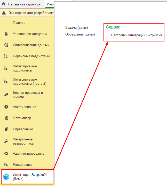 После создания технических учетных записей наступает этап Настройки. В расширение входит общая форма «Настройка интеграции Битрикс». Откроем её.