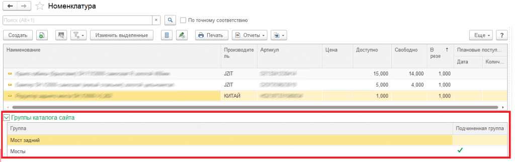 В форме списка добавлена раскрываемая группа со списком групп каталога сайта, в которые входит текущая строка номенклатуры. "Подчиненная группа" обозначает, что на сайт выведена вся группа-родитель (поиск по иерархии по всем родителям) номенклатуры.