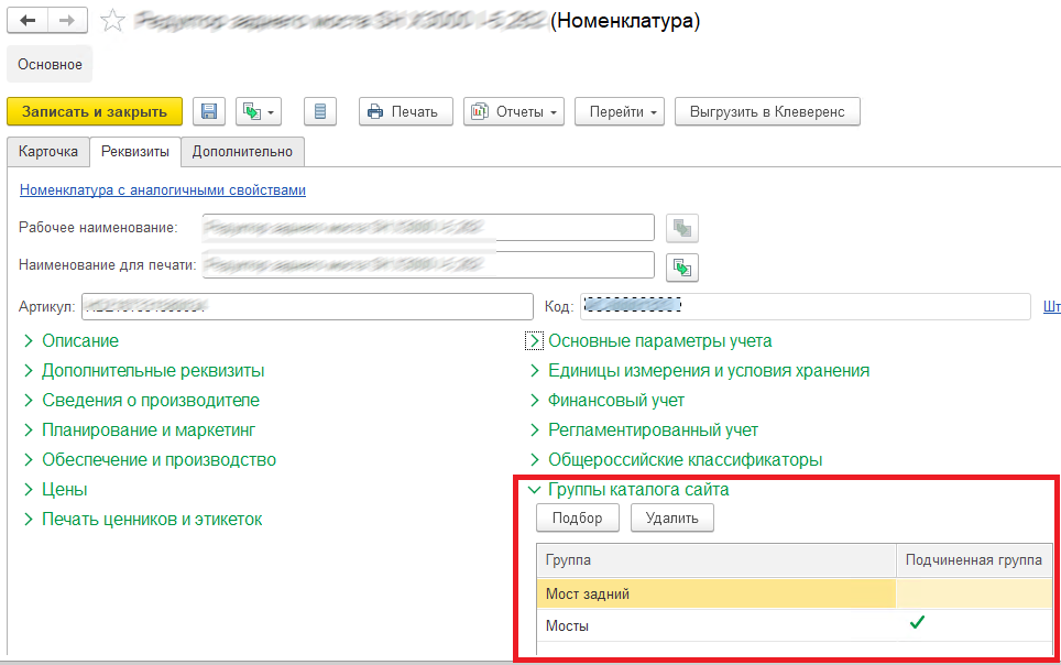В форме списка добавлена раскрываемая группа со списком групп каталога сайта, в которые входит текущая строка номенклатуры. "Подчиненная группа" обозначает, что на сайт выведена вся группа-родитель (поиск по иерархии по всем родителям) номенклатуры.