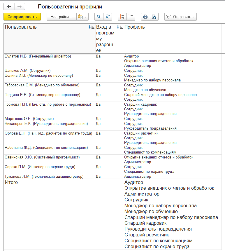 Отчет, позволяющий сформировать данные по пользователям с назначенными им профилями.