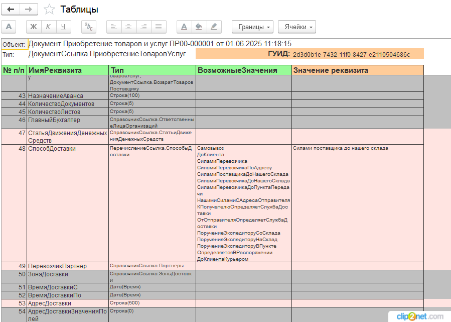 • Технический тип данных: Выводится в строгом формате платформы (например, ДокументСсылка.ЗаказКлиентаСтрока(150)Число(15,2)).