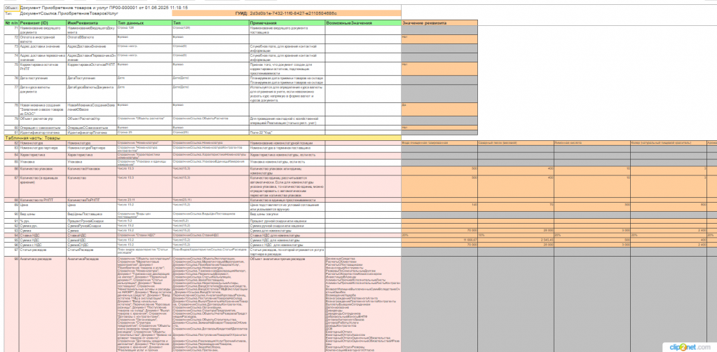 Выводятся реквизиты шапки, а табличные части разворачиваются по горизонтали! Если в табличной части "Товары" 10 строк, обработка добавит вправо 10 колонок со значениями для каждого реквизита ТЧ. Это позволяет наглядно увидеть, как именно заполняются многострочные документы в реальности.