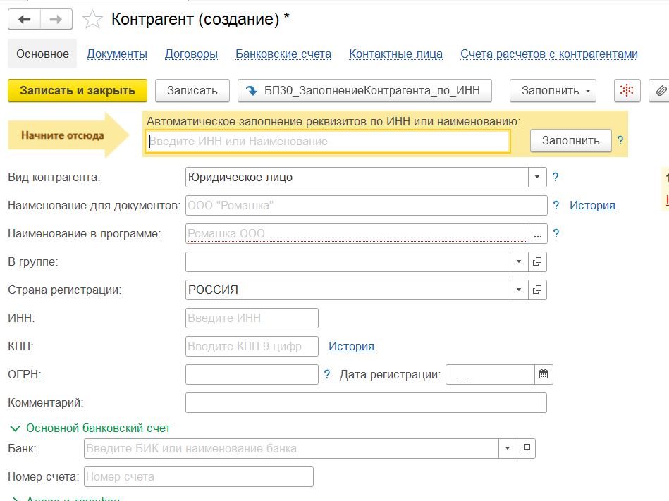 Заполнение реквизитов контрагента по ИНН для 1С: Бухгалтерия 3.0