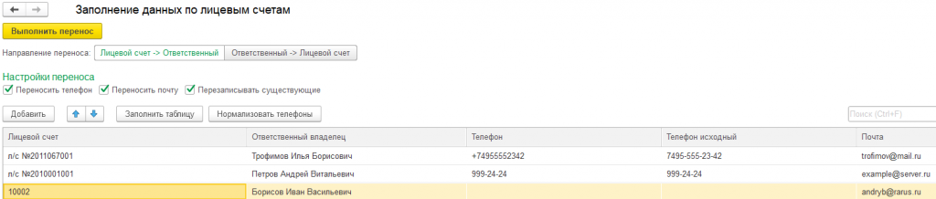 Перенос контактных данных между лицевыми счетами и ответственными владельцами