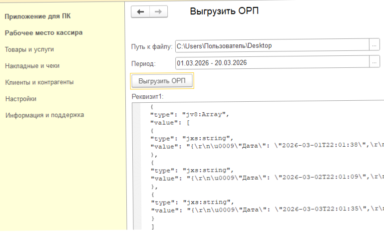 Данная обработка собирает данные для выгрузки ОРП (отчет о розничных продажах) и выгружает их в виде массива структур. Каждая структура в массиве содержит данные для формирования отдельного документа ОРП. Далее сформированный и записанный файл в формате JSON можно загрузить в управляющую программу и преобразовать данные на стороне управляющей программы в документы ОРП. В выгрузку попадают все необходимые данные для формирования ОРП и заполнения всех табличных частей, включая работу с маркированными товарами.
