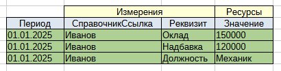 У хранения данных в регистрах сведений с периодичностью, относящихся к элементам справочников, на мой взгляд можно заметить два основных способа их размещения: 1 — параллельное размещение данных; 2 — последовательное размещение данных. На практике в подавляющем большинстве применяется способ 1 — параллельное размещение данных. При данном способе в одной записи регистра расположены все обозначенные именами значения, относящиеся к элементу справочника, на конкретный период. Т.е. под каждое обозначенное некоторым именем значение выделяется отдельный ресурс регистра сведений.
