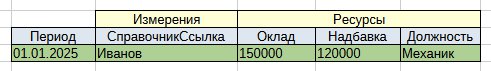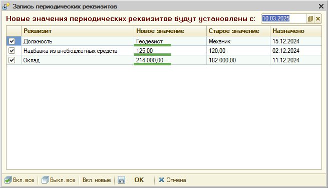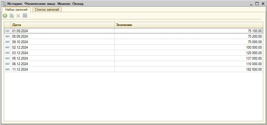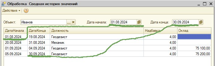 В приведенном примере сводная история реквизитов Должность, Надбавка, Оклад по физ.лицу Иванов за период 01.08.2024-30.09.2024. Каждая строка в таблице содержит значения актуальные в периоде, указанном в соотв.ячейках колонок ДатаНачала — ДатаКонца. Функция ПериодическиеРеквизиты.СводнаяИсторияЗначений() используется в документе тестовой демо-конфигурации НачислениеЗарплаты для заполнения табл.части периодическими данными сотрудников (Справочник.ФизическиеЛица).