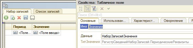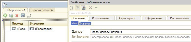 Это потому, что табличное поле Значения на форме должно быть связано со своим регистром сведений. И к сожалению, не получилось разработать единую форму для всех, входящих в функционал, регистров сведений. Проблема в том, что не удается программно назначать связь с табличным полем на форме и реквизитом формы, являющимся набором записей регистра.