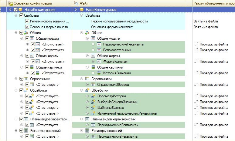 1. Добавить в нее объекты метаданных согласно изображению выше. Представленные на этом изображении объекты метаданных составляют собственно функционал периодических реквизитов.